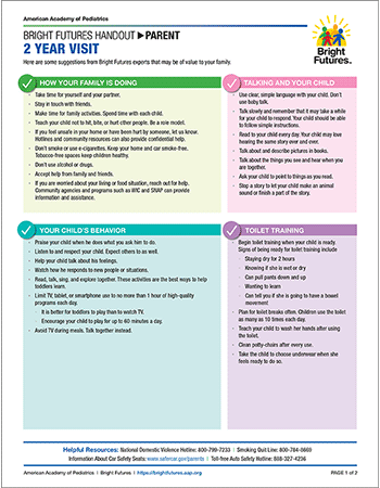 The Bright Futures publications provides key recommendations for themes critical to healthy child development along with well-child supervision standards for 31 age-based visits - from newborn through 21 years.